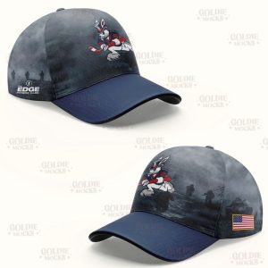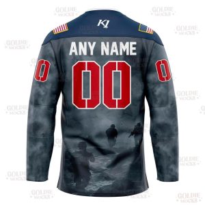 Prepare for an immediate connection to team pride and patriotic honor with the Danbury Hat Tricks ” Military Night ” Hockey Jersey 2025. This exceptional collectible allows fans to salute our heroes while showcasing unwavering support for their beloved team. The jersey features a striking military-inspired dark grey and charcoal camouflage base, subtly depicting silhouetted soldiers on patrol, evoking a sense of solemn respect. Deep navy blue shoulder yokes and collar provide a sharp contrast, accented by vibrant red details. Front and center, the iconic Danbury Hat Tricks rabbit mascot charges forward, patriotically dressed in an Uncle Sam hat, wielding a hockey stick. Emblems include the NAHL logo on the left chest and The Edge Fitness Club logo on the right, with prominent American flags proudly displayed on both shoulders. The back design mirrors the impactful soldier motif, ready for personalized name and number customization. Crafted from 100% premium quality, breathable polyester fabric, this jersey offers an athletic fit designed for comfort and durability, ensuring it will be a cherished item for years to come.