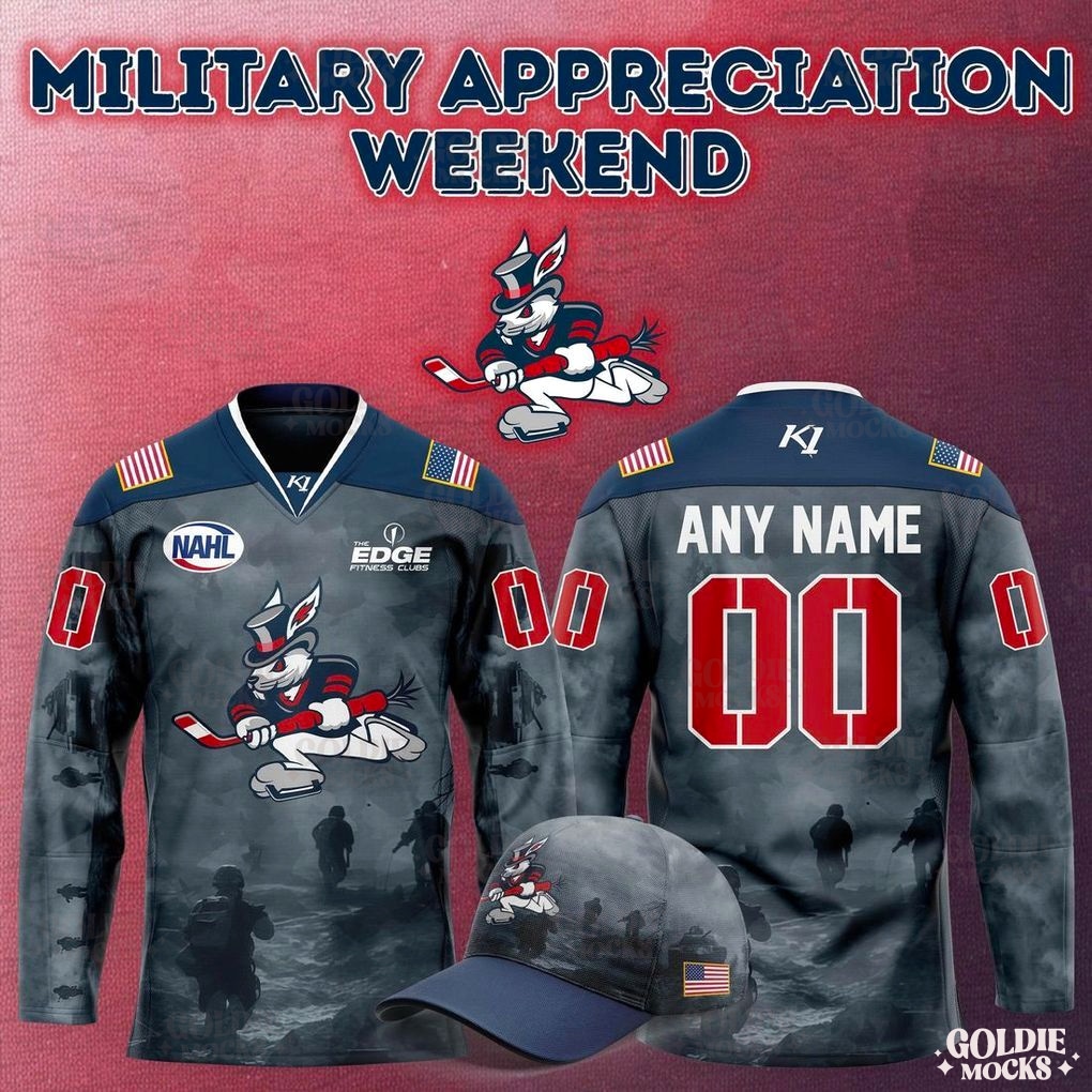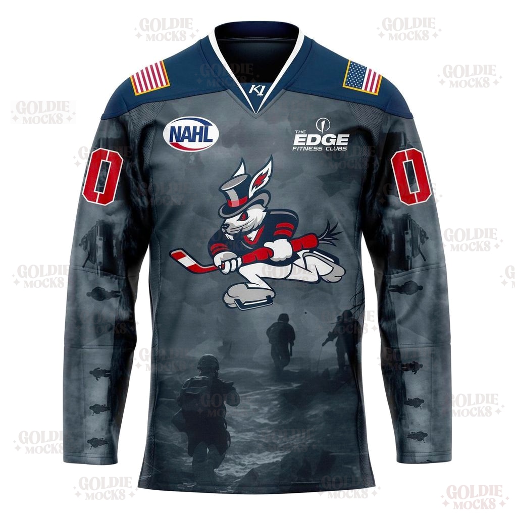 Prepare for an immediate connection to team pride and patriotic honor with the Danbury Hat Tricks ” Military Night ” Hockey Jersey 2025. This exceptional collectible allows fans to salute our heroes while showcasing unwavering support for their beloved team. The jersey features a striking military-inspired dark grey and charcoal camouflage base, subtly depicting silhouetted soldiers on patrol, evoking a sense of solemn respect. Deep navy blue shoulder yokes and collar provide a sharp contrast, accented by vibrant red details. Front and center, the iconic Danbury Hat Tricks rabbit mascot charges forward, patriotically dressed in an Uncle Sam hat, wielding a hockey stick. Emblems include the NAHL logo on the left chest and The Edge Fitness Club logo on the right, with prominent American flags proudly displayed on both shoulders. The back design mirrors the impactful soldier motif, ready for personalized name and number customization. Crafted from 100% premium quality, breathable polyester fabric, this jersey offers an athletic fit designed for comfort and durability, ensuring it will be a cherished item for years to come.