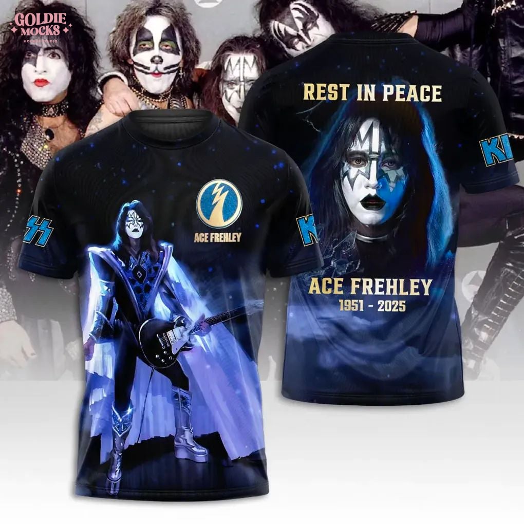 Connect with the enduring legacy of rock and roll with the Founding guitarist for KISS T-Shirt, a true collectible for any devoted fan. The front design plunges you into a cosmic dreamscape, featuring a vibrant, full-body depiction of Ace Frehley in his iconic “Spaceman” persona, guitar in hand, against a starry dark blue and black backdrop. His legendary cape flows with electric blue and purple hues, embodying his dynamic stage presence. Adorning the left sleeve is a stylized blue “K” and the right a “S”, while a prominent circular emblem on the chest showcases a golden lightning bolt and “ACE FREHLEY” text, all meticulously rendered. The reverse side presents a powerful, atmospheric portrait of Ace Frehley in full Spaceman makeup, bathed in cool blue light, above “REST IN PEACE” and “ACE FREHLEY 1951 – 2025” in shimmering gold text, echoing a heartfelt tribute. Crafted from a premium, lightweight polyester blend, this Founding guitarist for KISS T-Shirt ensures maximum comfort and durability. Its soft, breathable fabric is perfect for all-day wear, featuring high-definition, all-over print graphics that resist fading, available in standard adult sizing.