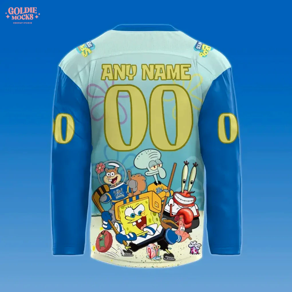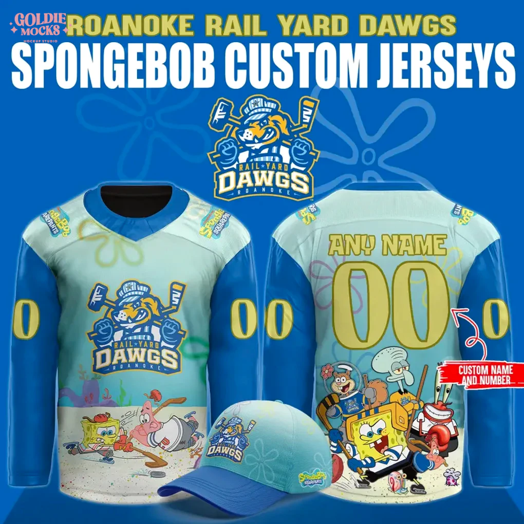 Dive headfirst into a wave of nostalgia and team spirit with the captivating Roanoke Rail Yard Dawgs SpongeBob New 2025 Jersey! This truly unique collectible allows fans to fuse their passion for the Roanoke Rail Yard Dawgs with the whimsical charm of Bikini Bottom. The front design is a vibrant spectacle, featuring the beloved Rail Yard Dawgs logo – a fierce, stick-wielding dog – proudly centered above a dynamic scene of SpongeBob and Patrick engaged in an epic hockey face-off on a sandy rink. The light blue body, subtly patterned with kelp and jellyfish, evokes the underwater world, transitioning to bold royal blue sleeves adorned with yellow “0”s. The back of this eye-catching jersey showcases an entire cast of SpongeBob characters, including Sandy, Squidward, Mr. Krabs, and Plankton, all united in a lively hockey game. Customization is key, with ample space for “ANY NAME” and your chosen “00” number in a playful yellow font. Crafted from premium quality 100% breathable performance polyester, this jersey promises ultimate comfort and durability, making the Roanoke Rail Yard Dawgs SpongeBob New 2025 Jersey ideal for active wear or display.